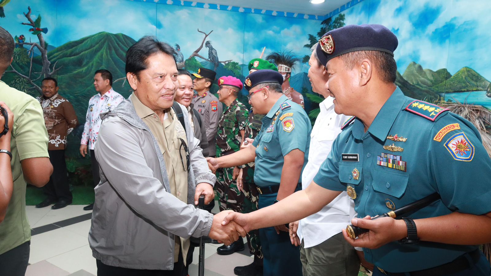 Penyambutan tersebut turut dihadiri oleh sejumlah pejabat tinggi daerah dan aparat keamanan, di antaranya Wakil Gubernur Papua Barat Daya Ahmad Nausrau, S.Pd.I., M.M., Danpasmar 3 Sorong Mayjen TNI (Mar) Andi Rahmat, M., Danrem 181/PVT Brigjen TNI Slamet Riady, S.I.P., Kapolda Papua Barat Daya Brigjen Pol Gatot Haribowo, S.I.K., M.A.P., serta unsur Forkopimda dan jajaran pemerintahan daerah lainnya.