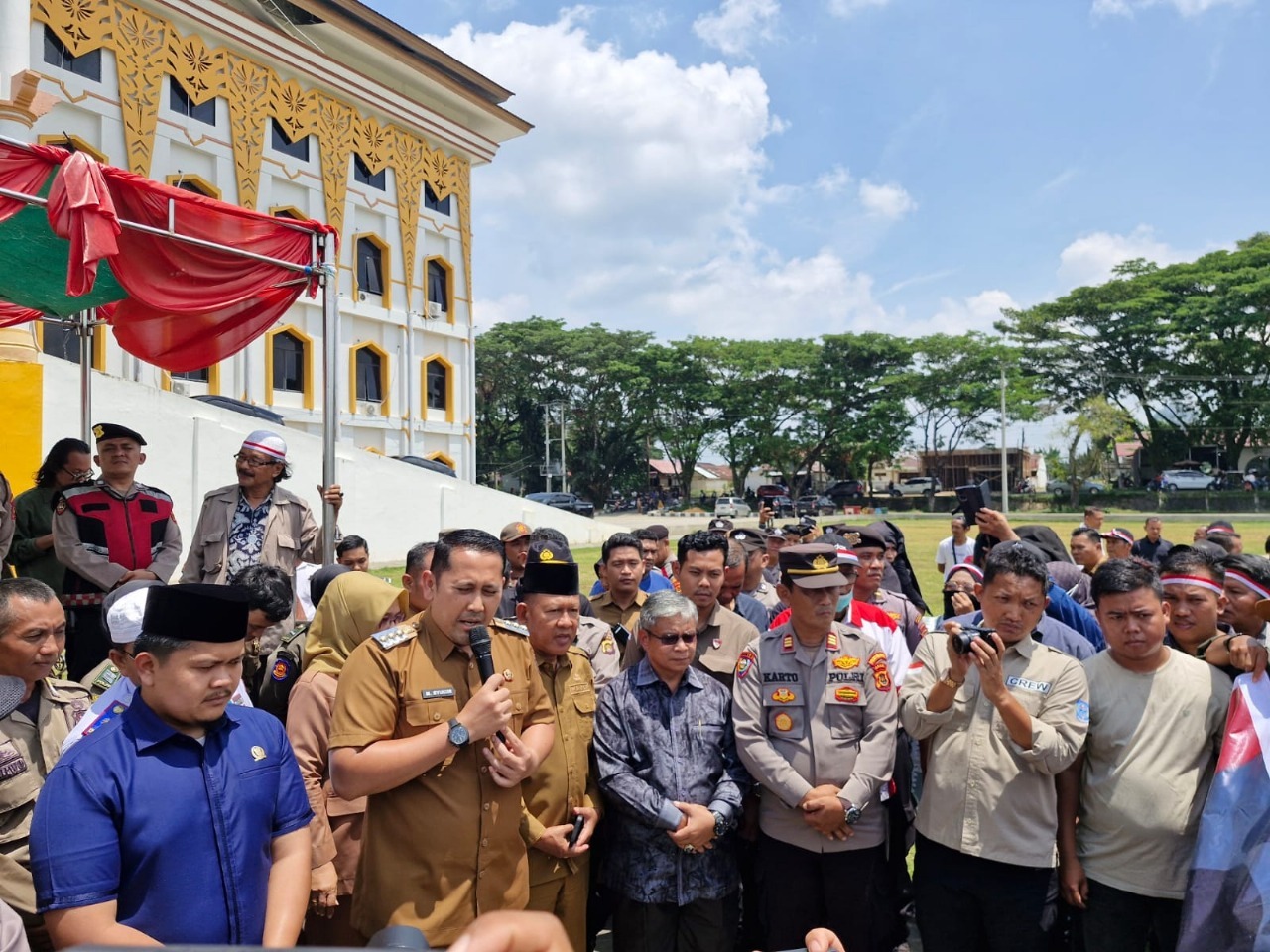 Setibanya di halaman Kantor Bupati, perwakilan massa melakukan orasi dan meminta kepala daerah menemui mereka. Bupati Merangin H. M. Syukur, S.H., M.H., didampingi Wakil Bupati Drs. H. Abdul Khafied, M.M., serta Ketua DPRD M. Rifal, S.Stp., langsung menemui massa dan menerima aspirasi yang disampaikan.