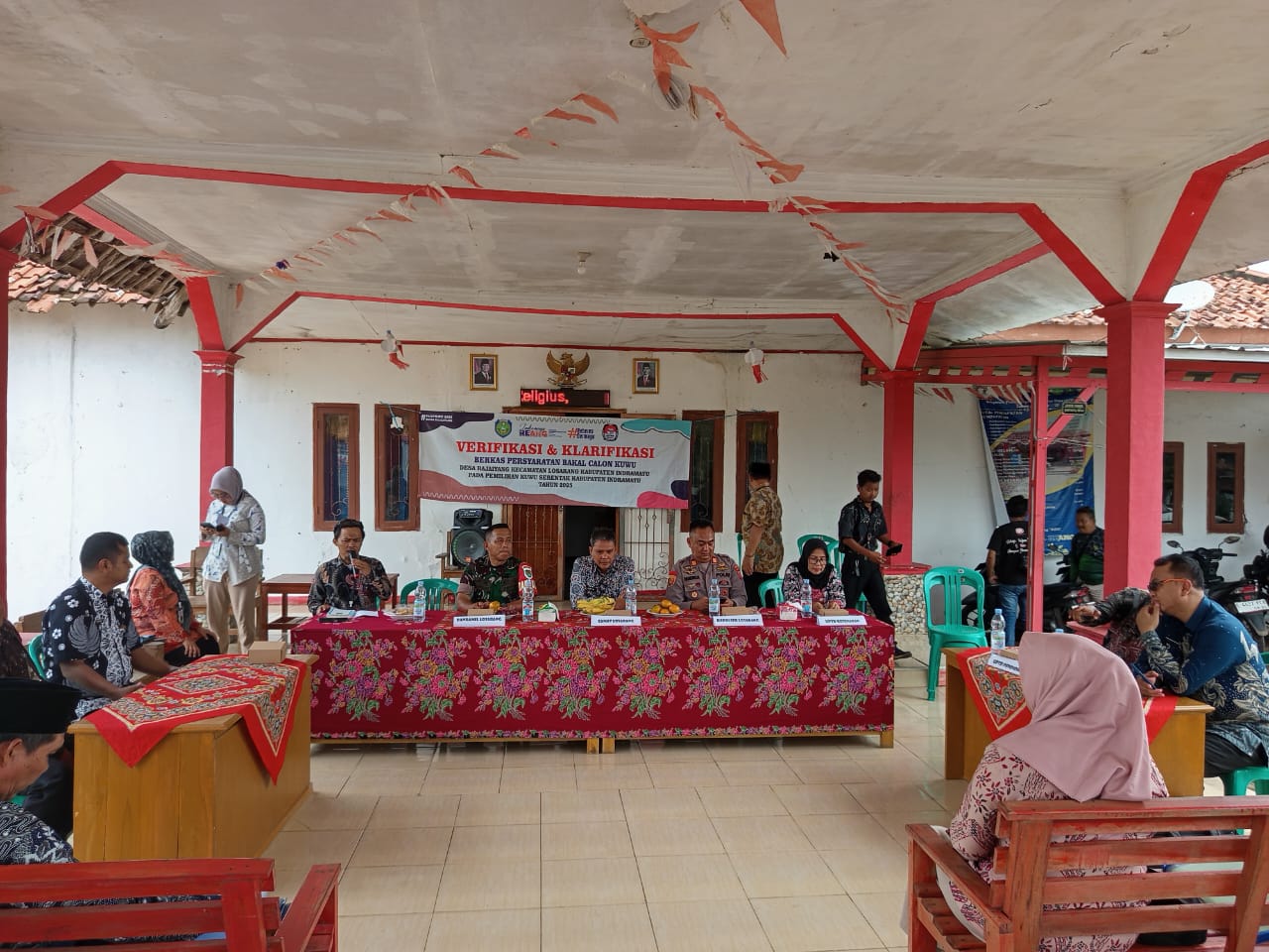 Terlihat Forkopimcam Losarang duduk berhadapan dengan panitia dan para bakal calon di ruangan terbuka yang dipenuhi kursi dan meja bermotif batik.