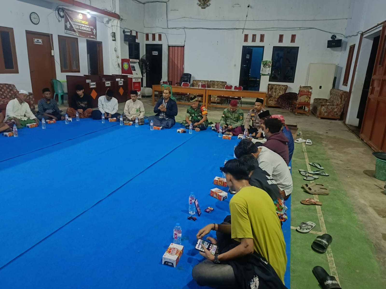 Di atas hamparan karpet biru yang memenuhi aula balai desa, masyarakat duduk melingkar sambil mengikuti rangkaian doa.