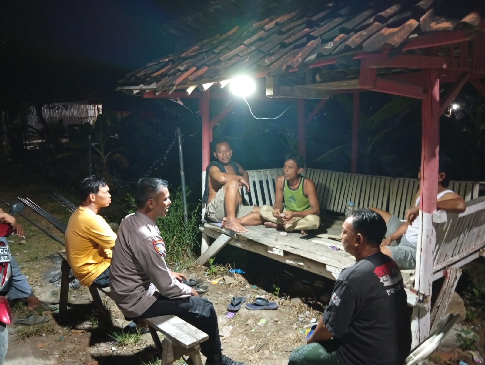 Bhabinkamtibmas Polsek Sukagumiwang, Aiptu Sofyan H., terlihat berdialog santai bersama warga yang sedang berjaga malam di pos ronda.
