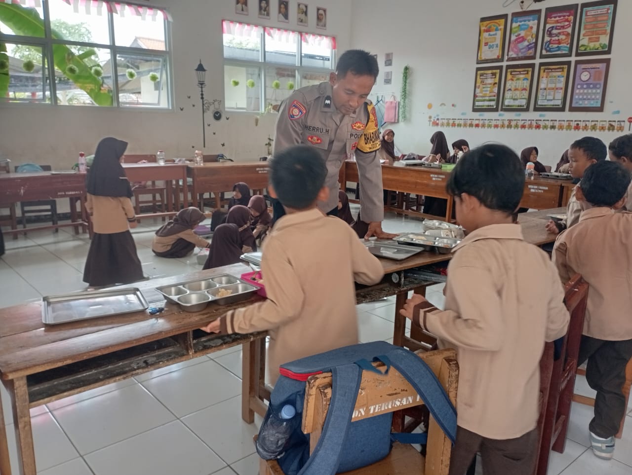 Di sejumlah sekolah, termasuk SDN 1 Terusan, petugas terlihat memantau langsung pelaksanaan makan bersama. Anak-anak duduk rapi di lantai kelas, menikmati makanan bergizi yang telah disiapkan sambil didampingi guru dan pihak kepolisian.