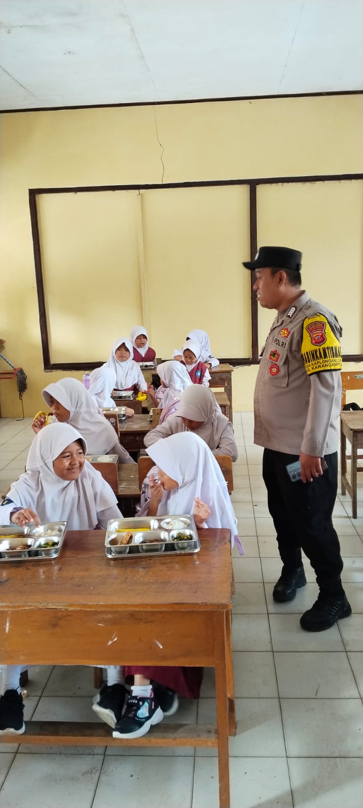Dalam kegiatan ini Bhabinkamtibmas Desa Kaplongan Kidul, yang memantau jalannya kegiatan makan bergizi gratis bersama para pelajar.