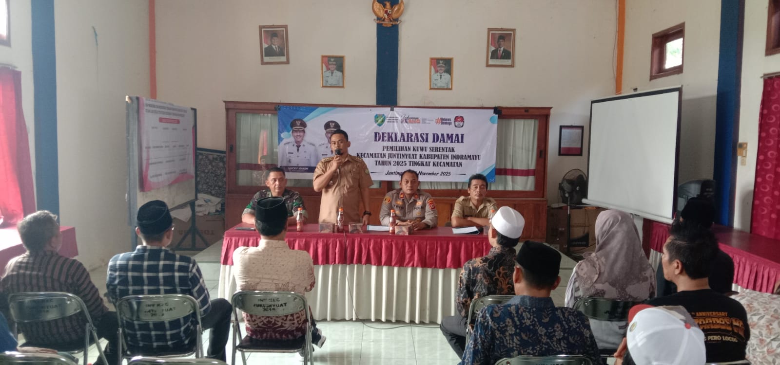 INDRAMAYU – Dalam rangka memastikan pelaksanaan Pemilihan Kuwu (Pilwu) Serentak Tahun 2025 berjalan aman, damai, dan kondusif, Polsek Juntinyuat Polres Indramayu Polda Jabar kegiatan Deklarasi Damai Pilwu serentak Tingkat Kecamatan Juntinyuat, yang digelar di Aula Bimasakti Kantor Kecamatan Juntinyuat, Senin (24/11/2025).
