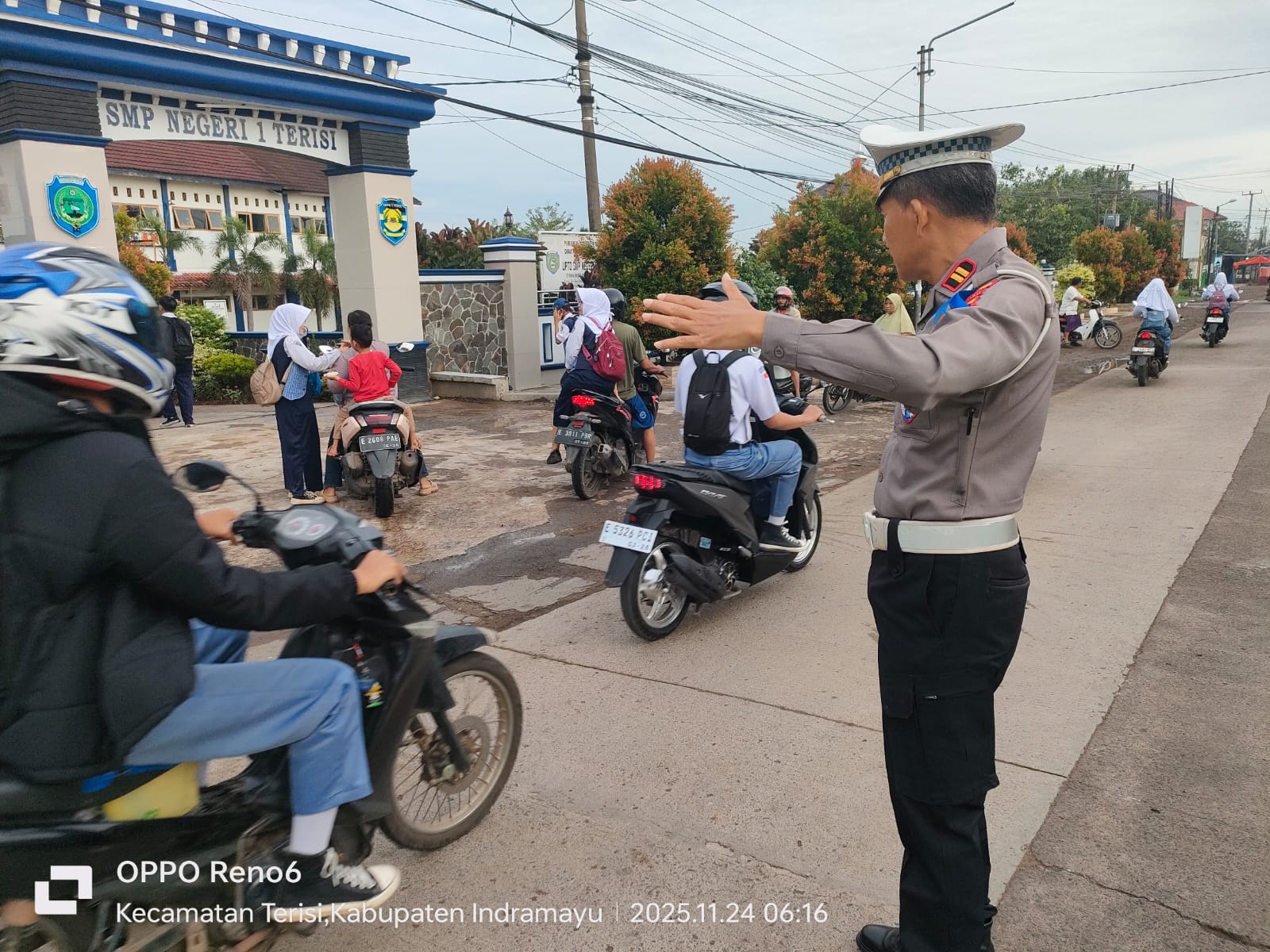 Indramayu – Guna menciptakan kelancaran arus lalu lintas serta memberikan rasa aman kepada pelajar, personel Polsek Terisi Polres Indramayu Polda Jabar melaksanakan kegiatan pengaturan lalu lintas (Gatur Pagi) di depan SMP Negeri 1 Terisi, Senin (24/11/2025) pagi.
