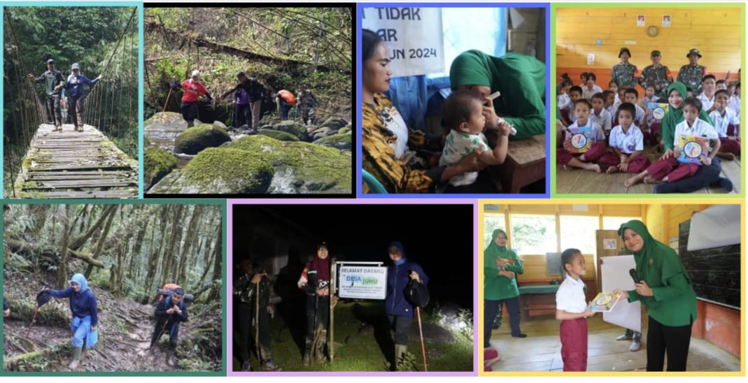 BARABAI, BUSERJATIM.COM GROUP-Ketua Persit Kartika Chandra Kirana Cabang XXV Kodim 1002 Koorcab Rem 101 PD XXII/Tambun Bungai Ny. Hapsari OP. Siregar turut serta dalam Tim ekspedisi Juhu menempuh lima hari perjalanan dengan berjalan kaki menembus hutan tropis dan pegunungan Meratus demi menyambangi dan memberikan pelayanan dasar di Desa Juhu, Kecamatan Batang Alai Timur (BAT), Kabupaten Hulu Sungai Tengah (HST).