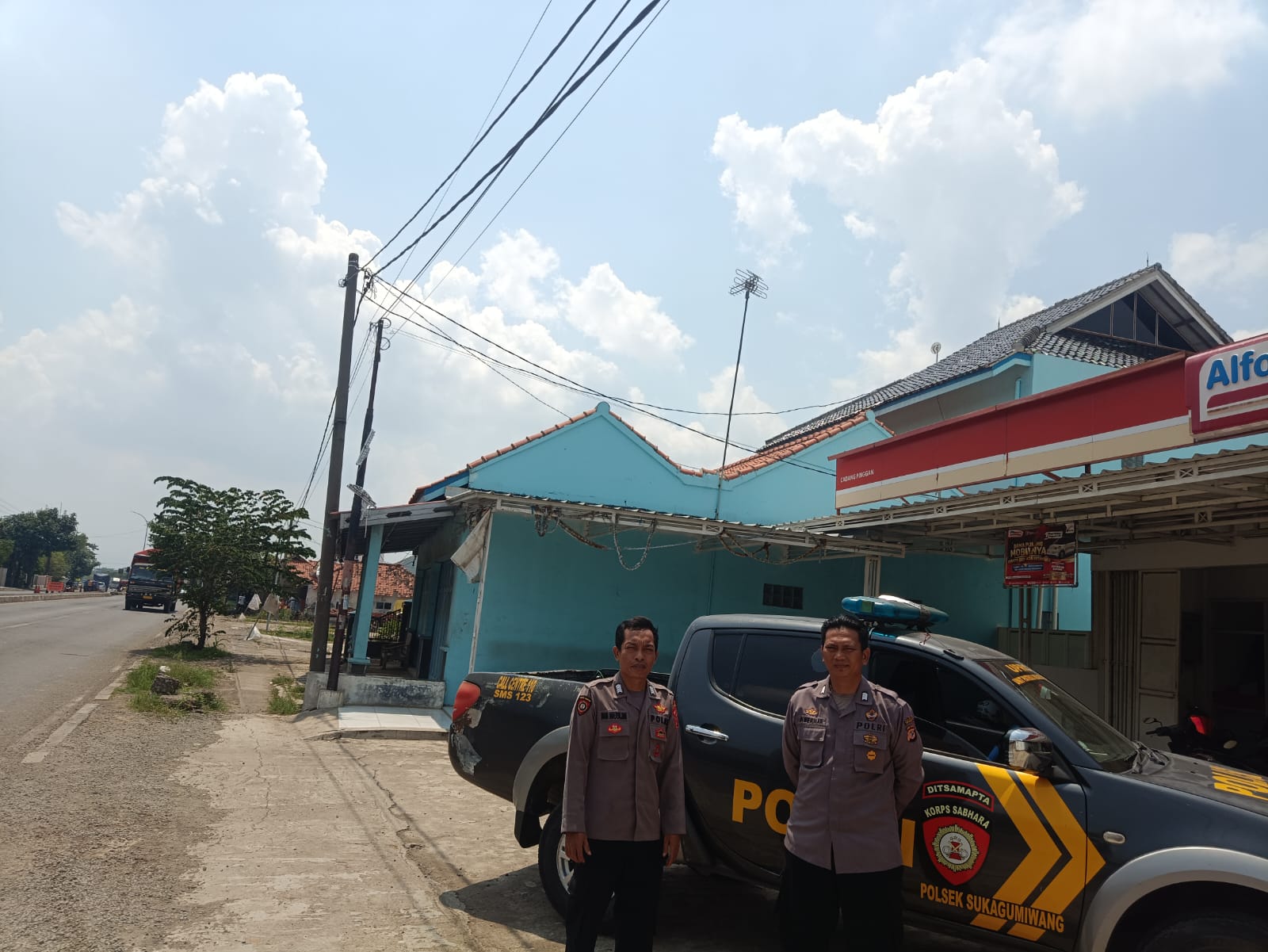 Minggu (30/11/2025), petugas terlihat melakukan patroli rutin di sepanjang jalur utama Kecamatan Sukagumiwang, termasuk kawasan pertokoan dan fasilitas publik yang ramai dikunjungi warga.