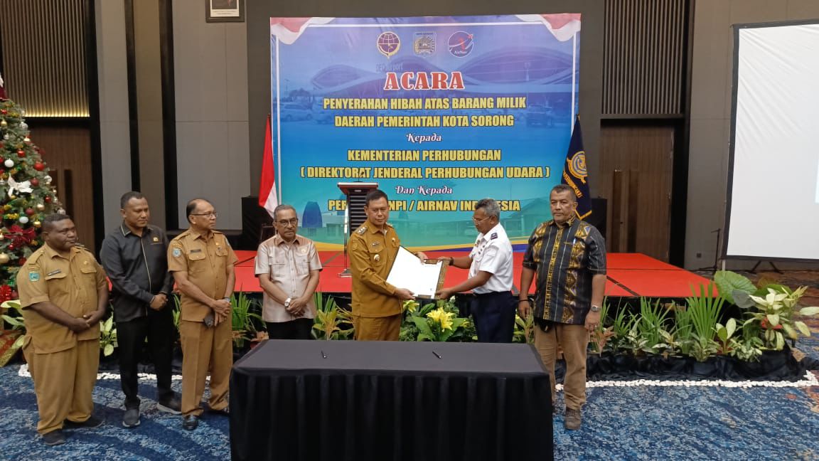 KOTA SORONG PBD, BUSERJATIM.COM GROUP– Pemerintah Kota Sorong kembali menunjukkan komitmennya dalam mendukung peningkatan pelayanan transportasi udara nasional melalui penyerahan hibah Barang Milik Daerah (BMD) kepada Kementerian Perhubungan Republik Indonesia dan Perum Lembaga Penyelenggara Pelayanan Navigasi Penerbangan Indonesia (LPPNPI/AirNav Indonesia).