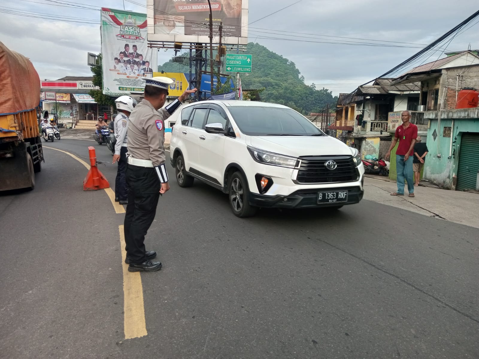 Anggota Polsek Ciampea tampak membantu masyarakat saat menyeberang jalan serta melakukan pengaturan arus kendaraan bermotor guna mencegah terjadinya kemacetan dan meminimalkan potensi kecelakaan lalu lintas.