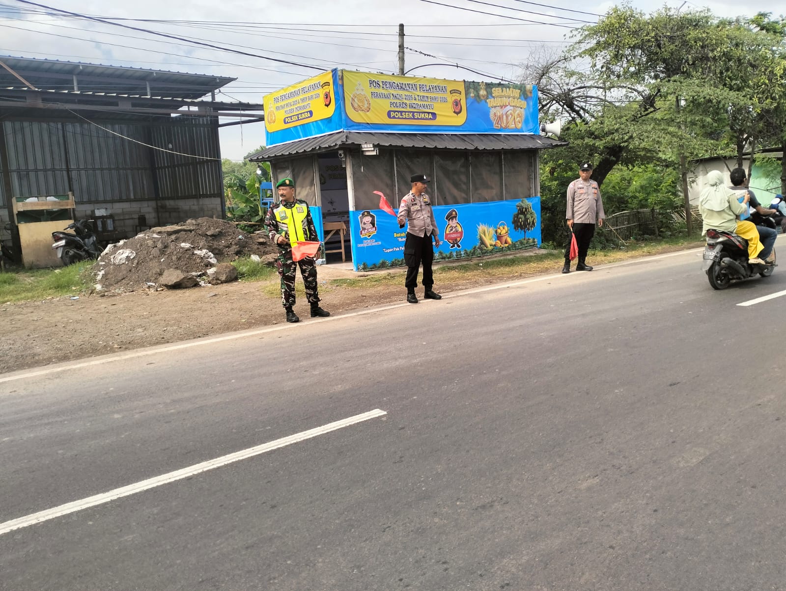 INDRAMAYU – Petugas pengamanan Operasi Lilin Lodaya 2025 di Pos Pengamanan (Pos Pam) Jembatan Sewo, wilayah hukum Polsek Sukra, melaksanakan pengaturan lalu lintas, Minggu pagi (21/12/2025).