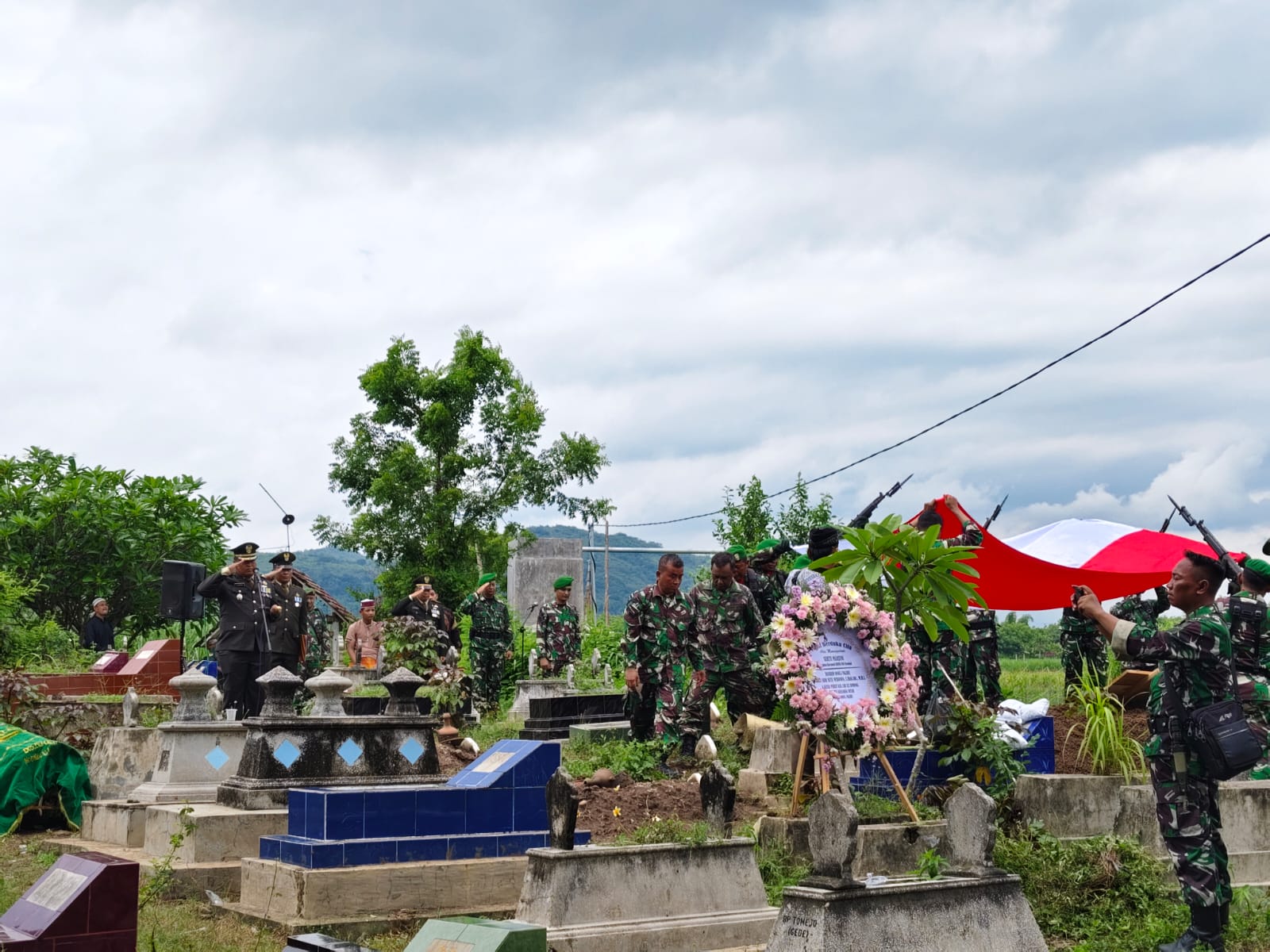 Upacara pemakaman militer tersebut dihadiri oleh jajaran perwira, anggota TNI, keluarga almarhum, serta warga sekitar. Prosesi berlangsung dengan penuh penghormatan, ditandai dengan tembakan salvo dan penyerahan bendera Merah Putih kepada pihak keluarga.