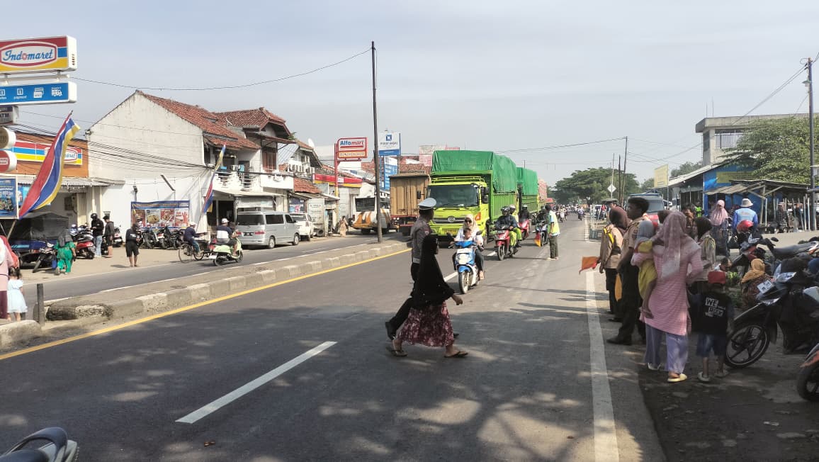 Personel Polsek Sukagumiwang tampak aktif mengatur arus lalu lintas, menghentikan kendaraan secara bergantian, serta membantu masyarakat termasuk lansia, ibu-ibu, dan anak-anak agar dapat menyeberang jalan dengan aman dan tertib.