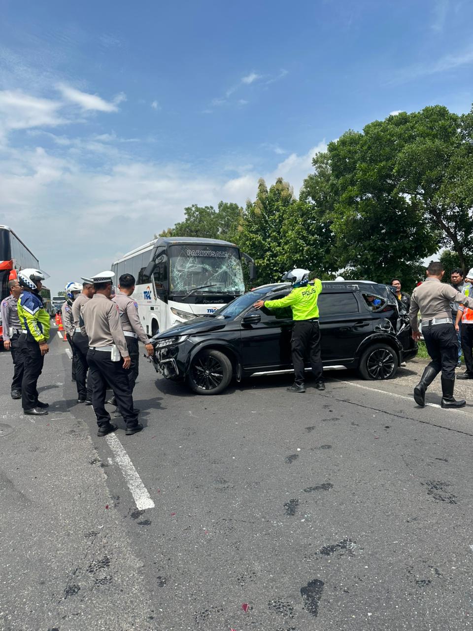 Insiden ini melibatkan satu unit minibus dan dua unit bus yang melaju searah dari Jakarta menuju Cirebon.