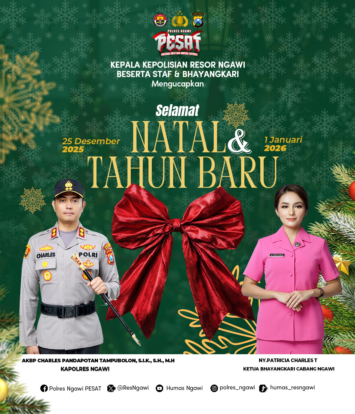 Ngawi – Kapolres Ngawi AKBP Charles Pandapotan Tampubolon, S.I.K., S.H., M.H., bersama Ketua Bhayangkari Cabang Ngawi Ny. Patricia Charles, memberikan ucapan selamat Natal tahun 2025 kepada seluruh umat Kristiani di Kabupaten Ngawi, pada Kamis (25/12/2025)