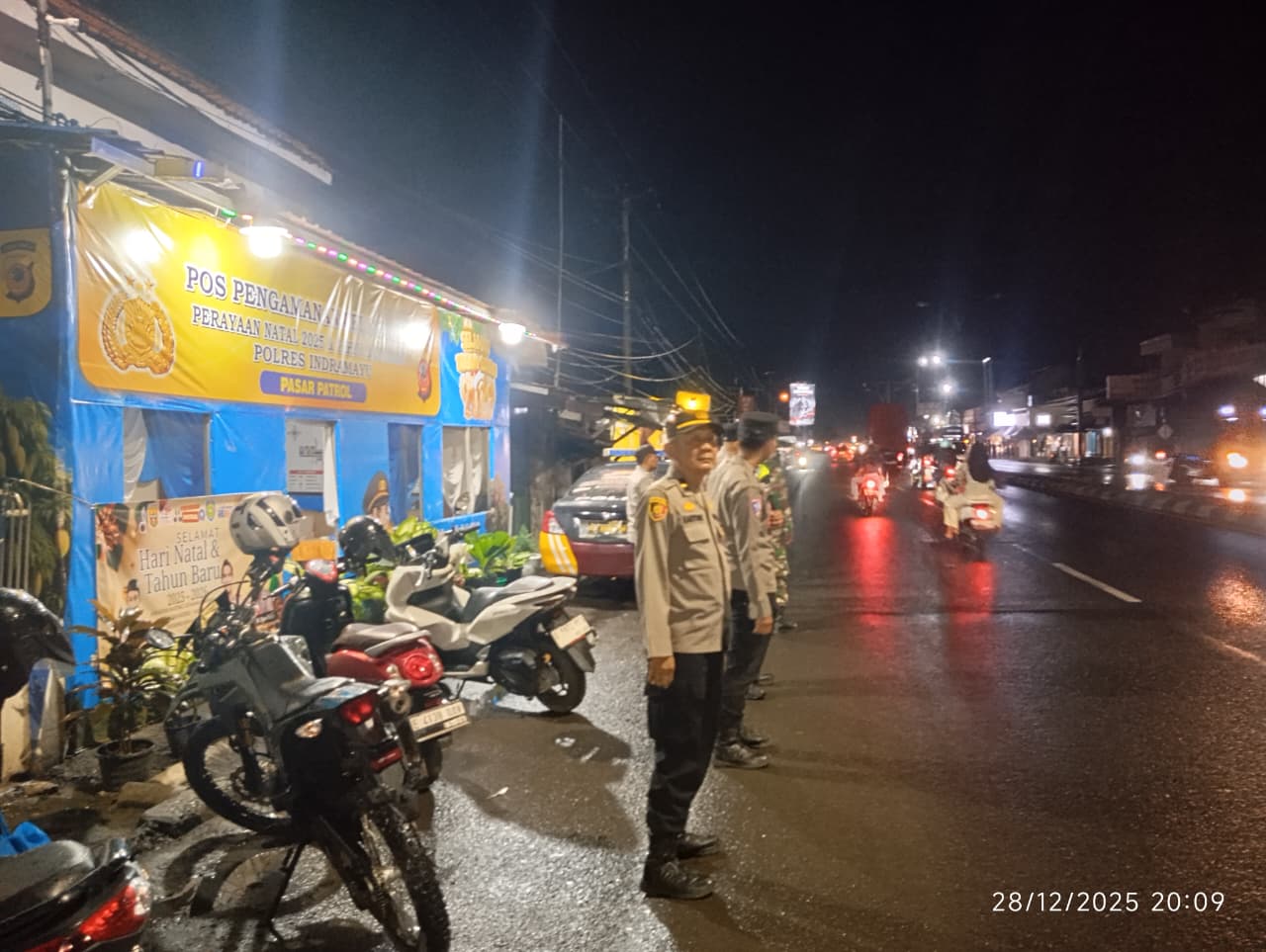 INDRAMAYU, — Polres indramayu Polda Jabar terus memperkuat pengamanan selama masa libur Natal 2025 dan Tahun Baru 2026 (Nataru). Salah satu titik yang menjadi fokus pengamanan berada di Pos Pengamanan (Pos Pam) Pasar Patrol, Kabupaten Indramayu, Minggu malam (28/12/2025).