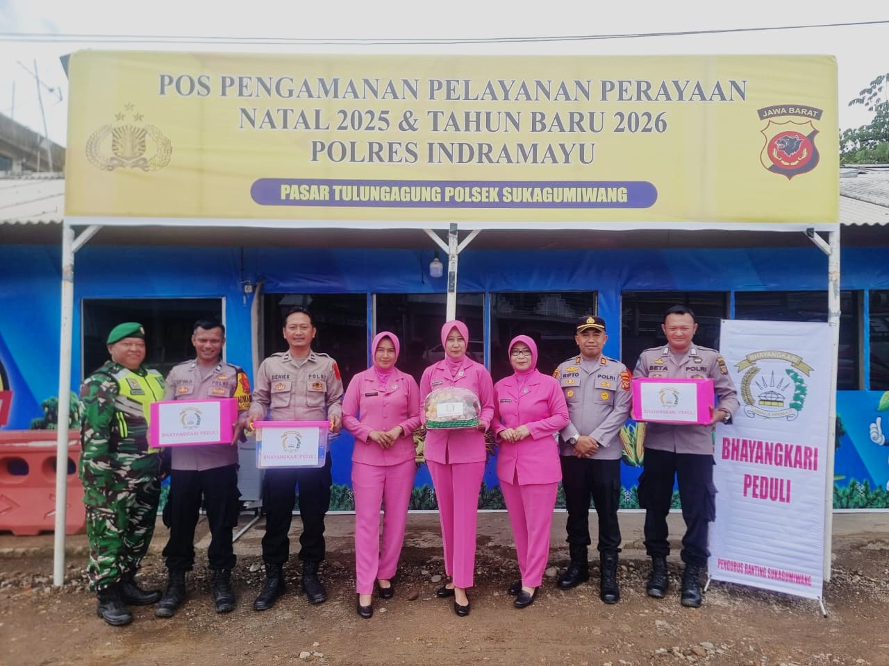 Melalui program Bhayangkari Peduli, Bhayangkari Ranting Sukagumiwang melaksanakan kunjungan ke Pos Pengamanan dan Pelayanan Perayaan Natal dan Tahun Baru (Pospam Nataru) Pasar Tulungagung, wilayah hukum Polsek Sukagumiwang, Kabupaten Indramayu, Senin (30/12/2025) kemarin.