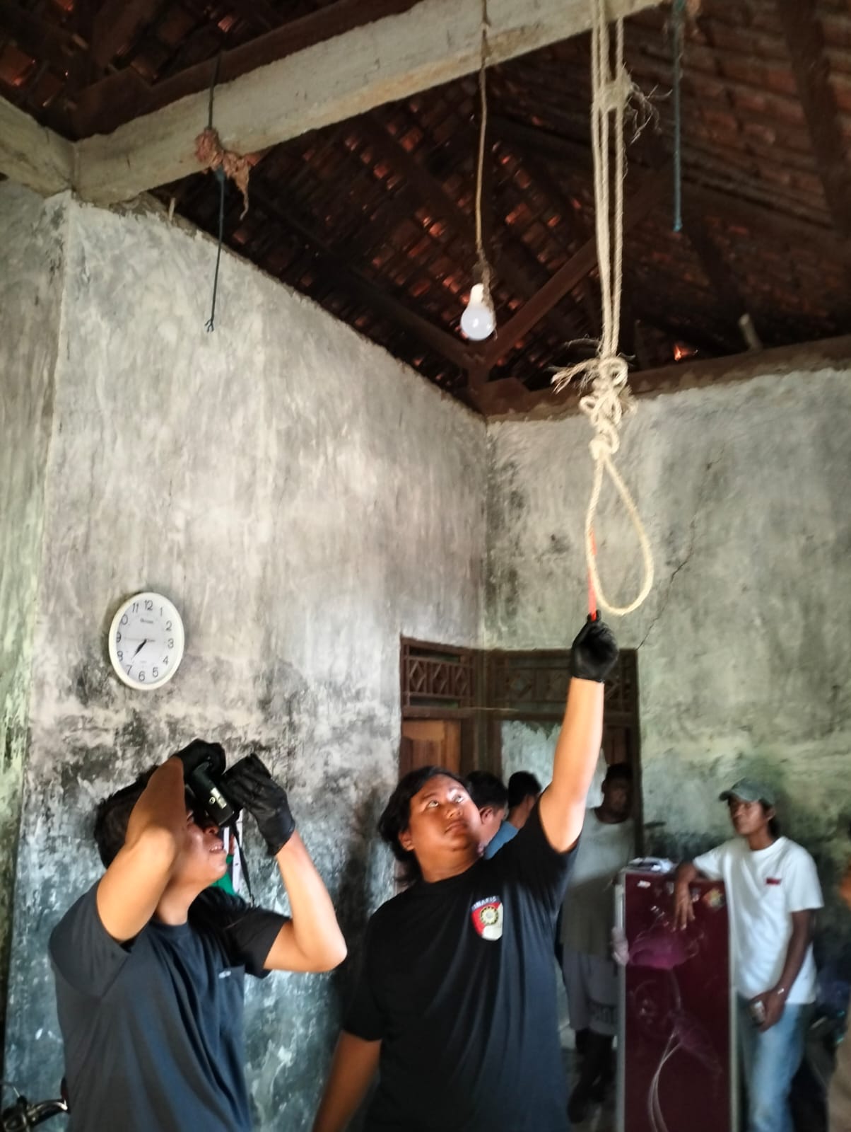 Dari hasil olah TKP, petugas menemukan sejumlah barang yang diduga berkaitan dengan peristiwa tersebut, di antaranya tali tambang nilon berwarna putih sepanjang sekitar 3,1 meter yang masih terikat pada balok beton, serta sebuah drum plastik berwarna putih yang diduga digunakan sebagai pijakan. Pada leher korban juga ditemukan bekas jeratan.