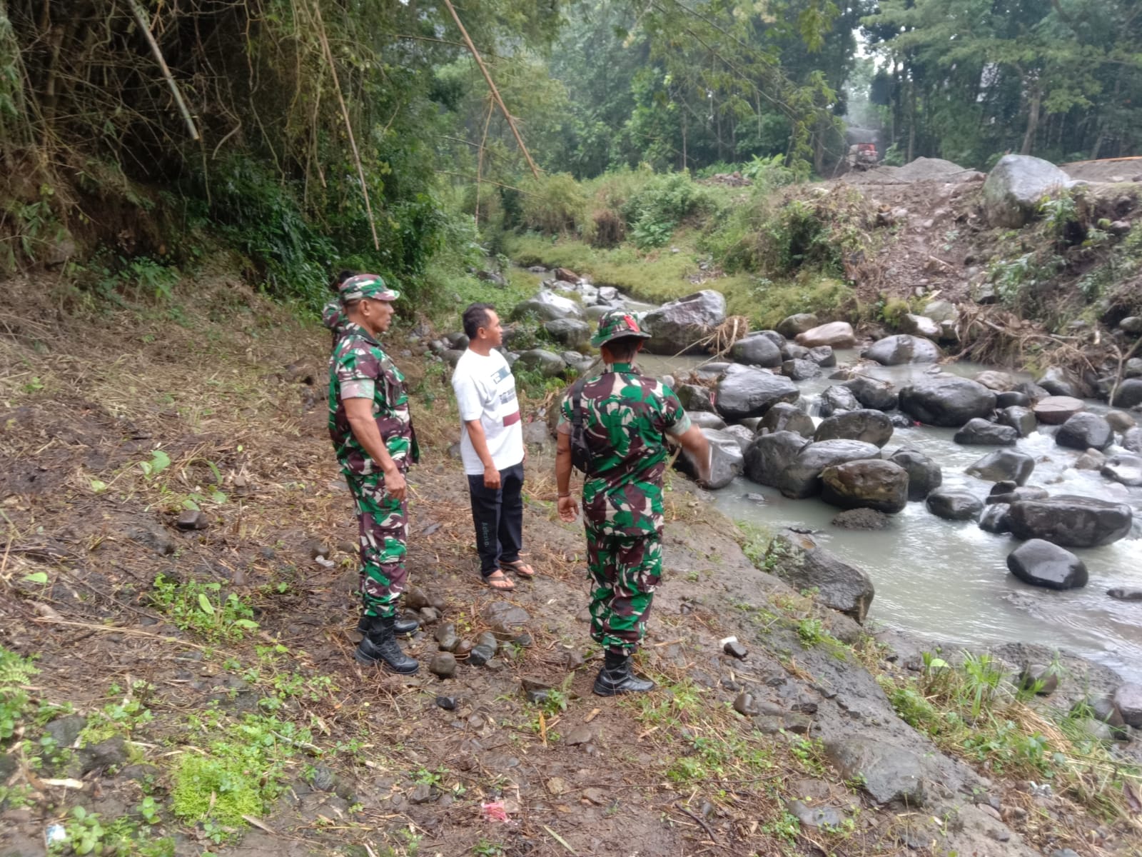 Sementara itu, tim teknis Pusziad melakukan pengukuran dan pengamatan terhadap kondisi tanah, alur sungai, serta lingkungan sekitar yang akan menjadi titik pembangunan jembatan. Hasil dari peninjauan ini akan menjadi bahan evaluasi dan perencanaan teknis lebih lanjut.