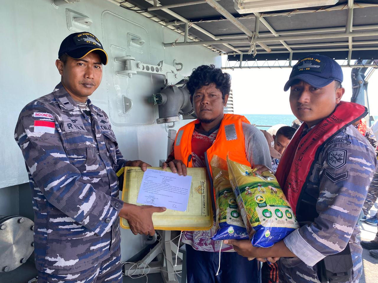 Selanjutnya, ​prajurit KRI Hampala-880 membagikan bantuan berupa beras dan obat-obatan secara langsung di atas kapal nelayan.