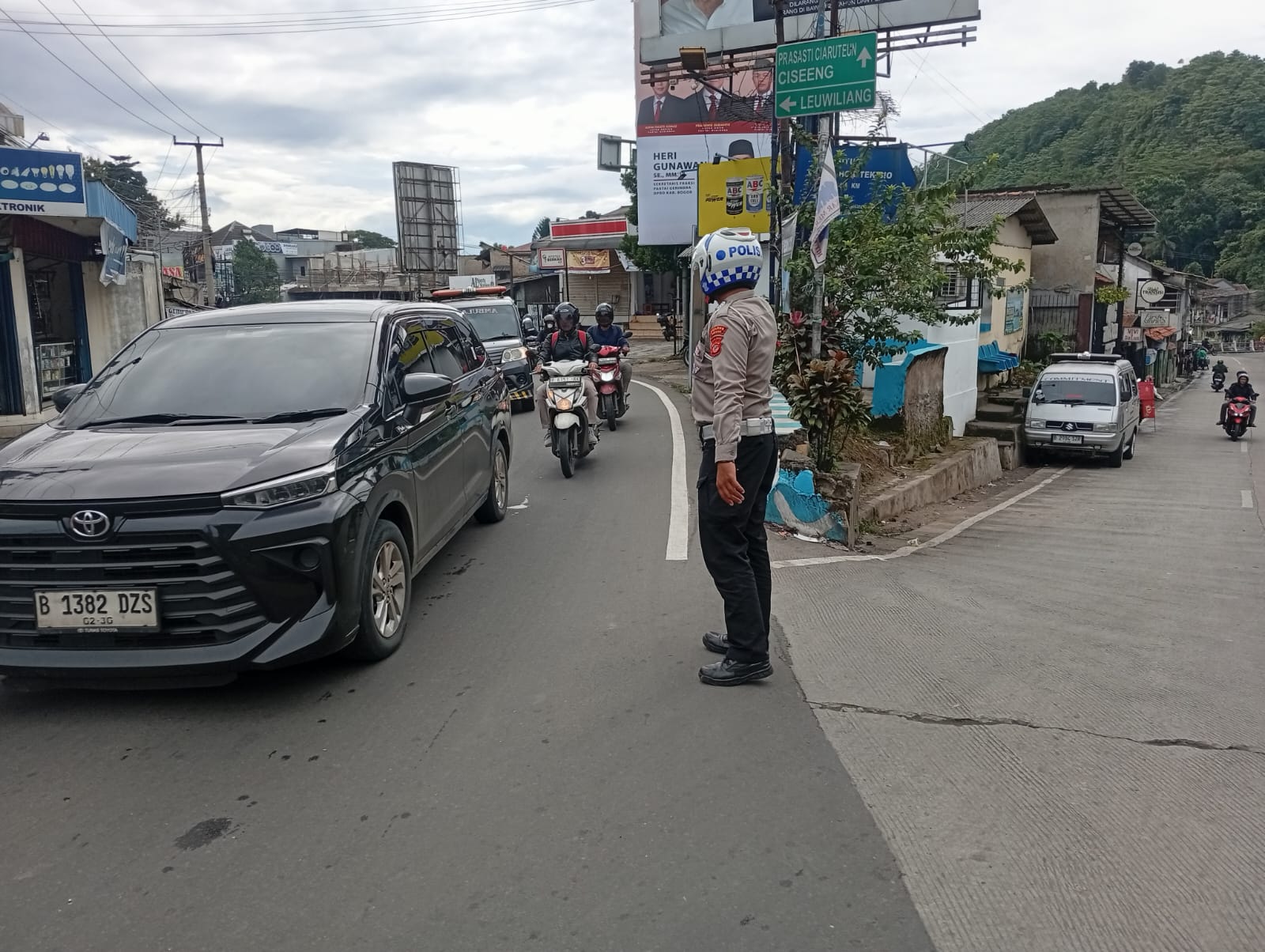 Anggota Lantas Polsek Ciampea Polres Bogor membantu masyarakat mengatur lalulintas dan ketika hendak menyebrang jalan, petugas juga melakukan pengaturan pengendara kendaraan bermotor agar terciptanya kamseltibcarlantas.