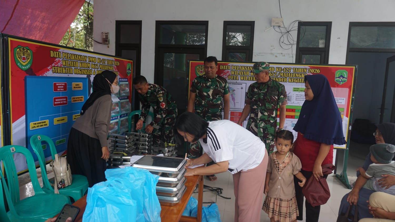 Majalengka – Senyum sumringah terpancar dari wajah para ibu dan balita saat Satgas TNI Manunggal Membangun Desa (TMMD) ke-127 Kodim 0617/Majalengka membantu kegiatan pembagian Makanan Bergizi Gratis (MBG) di Balai Desa Sindangwangi, Kecamatan Sindangwangi, Kabupaten Majalengka, Kamis (12/2/2026).