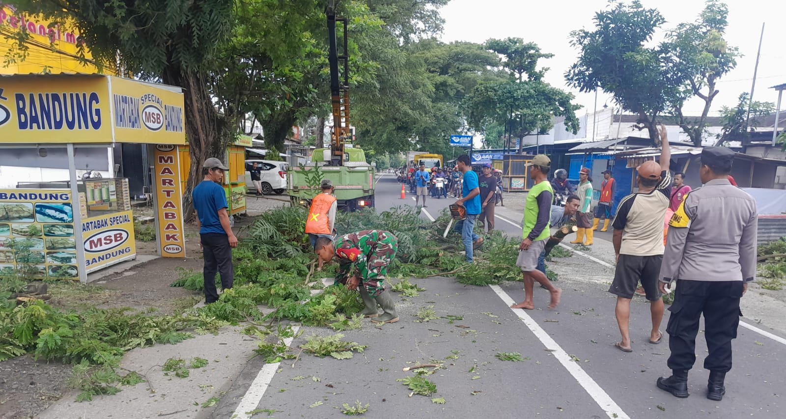 Terkait hal itu,Babinsa Desa Kandangan Serka Supardi dan Bhabinkamtibmas selain membantu masyarakat melakukan pemangkasan cabang dan ranting pohon juga memberikan pengamanan di sekitar lokasi.