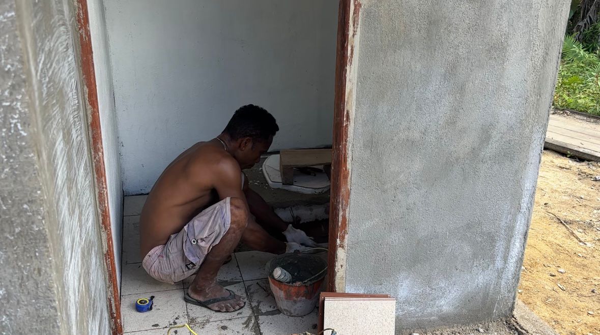 TMMD Ke-127 Kodim 1804/Kaimana: Lanjut Pemasangan Tegel 2 Unit MCK di Kampung Sisir Capai 65 Persen