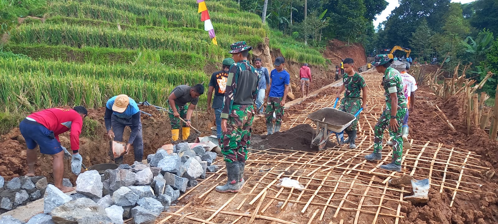 Selain personel TNI, kegiatan ini juga melibatkan partisipasi aktif masyarakat setempat. Semangat gotong royong antara TNI dan warga menjadi kekuatan utama dalam mempercepat penyelesaian sasaran fisik TMMD.
