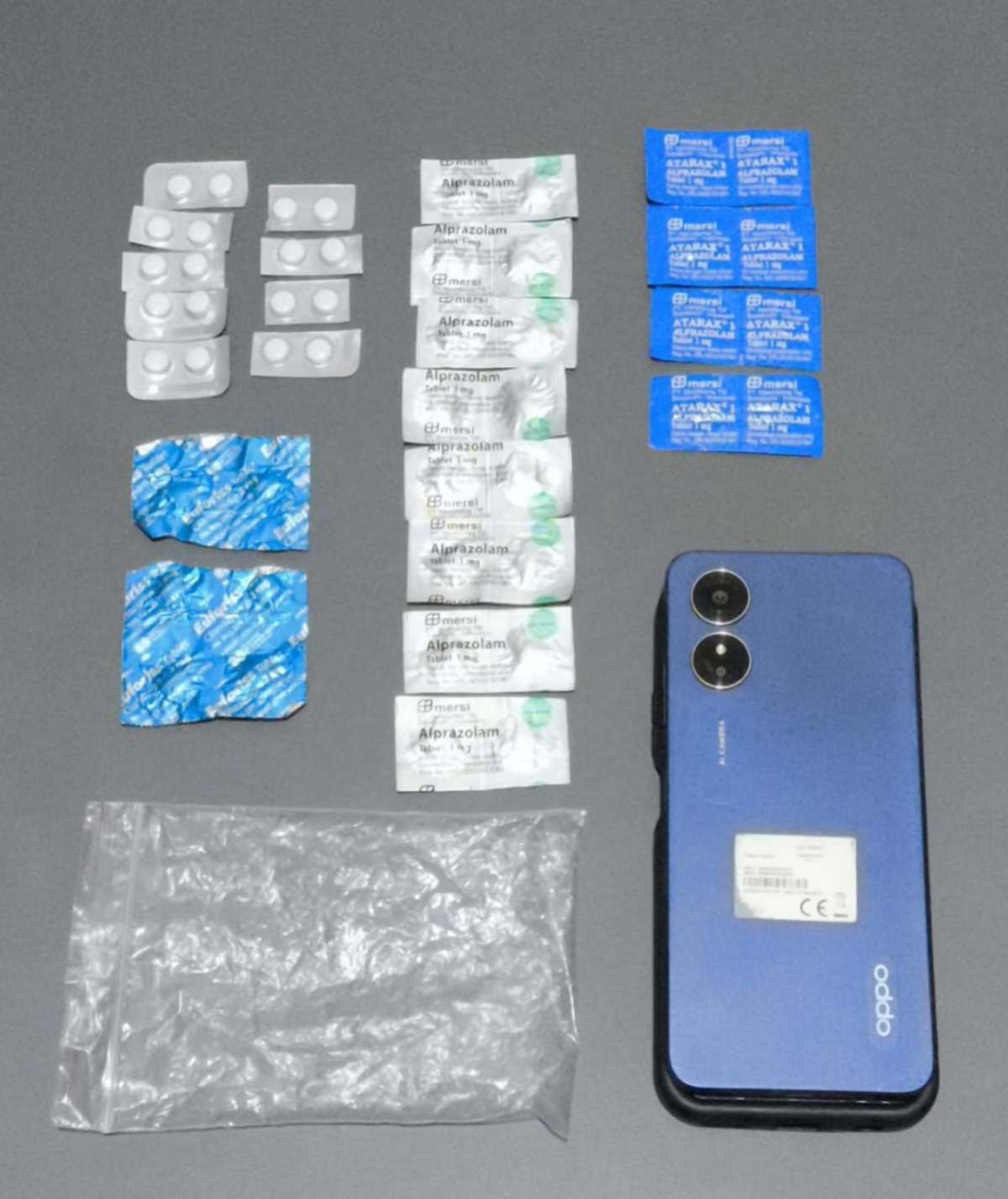 18 (delapan belas) butir obat psikotropika diduga jenis MERSI RIKLONA 2 mg, 16 (enam belas) butir obat psikotropika diduga jenis MERSI ALPRAZOLAM 1 mg,
