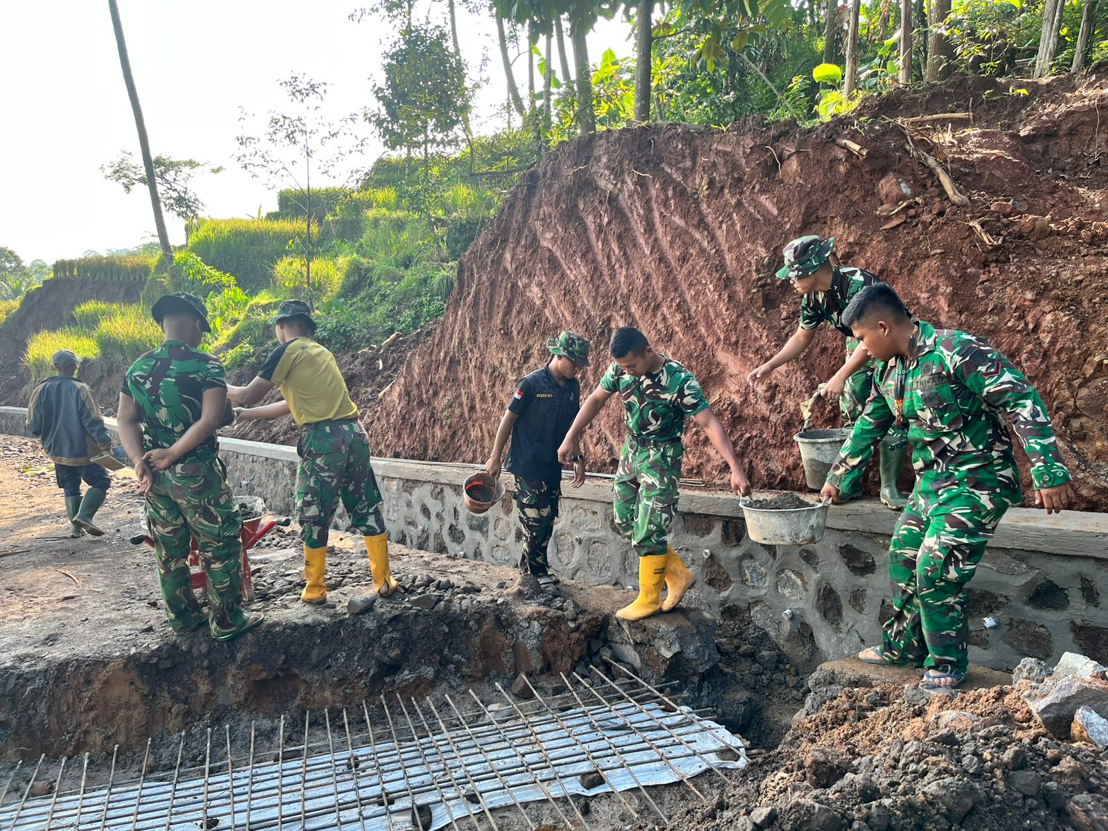 Semangat kebersamaan antara TNI dan masyarakat terlihat jelas di lokasi pekerjaan. Dengan gotong royong, mereka bahu-membahu menyelesaikan pengecoran gorong-gorong sebagai bagian dari pembangunan infrastruktur desa yang menjadi sasaran program TMMD.