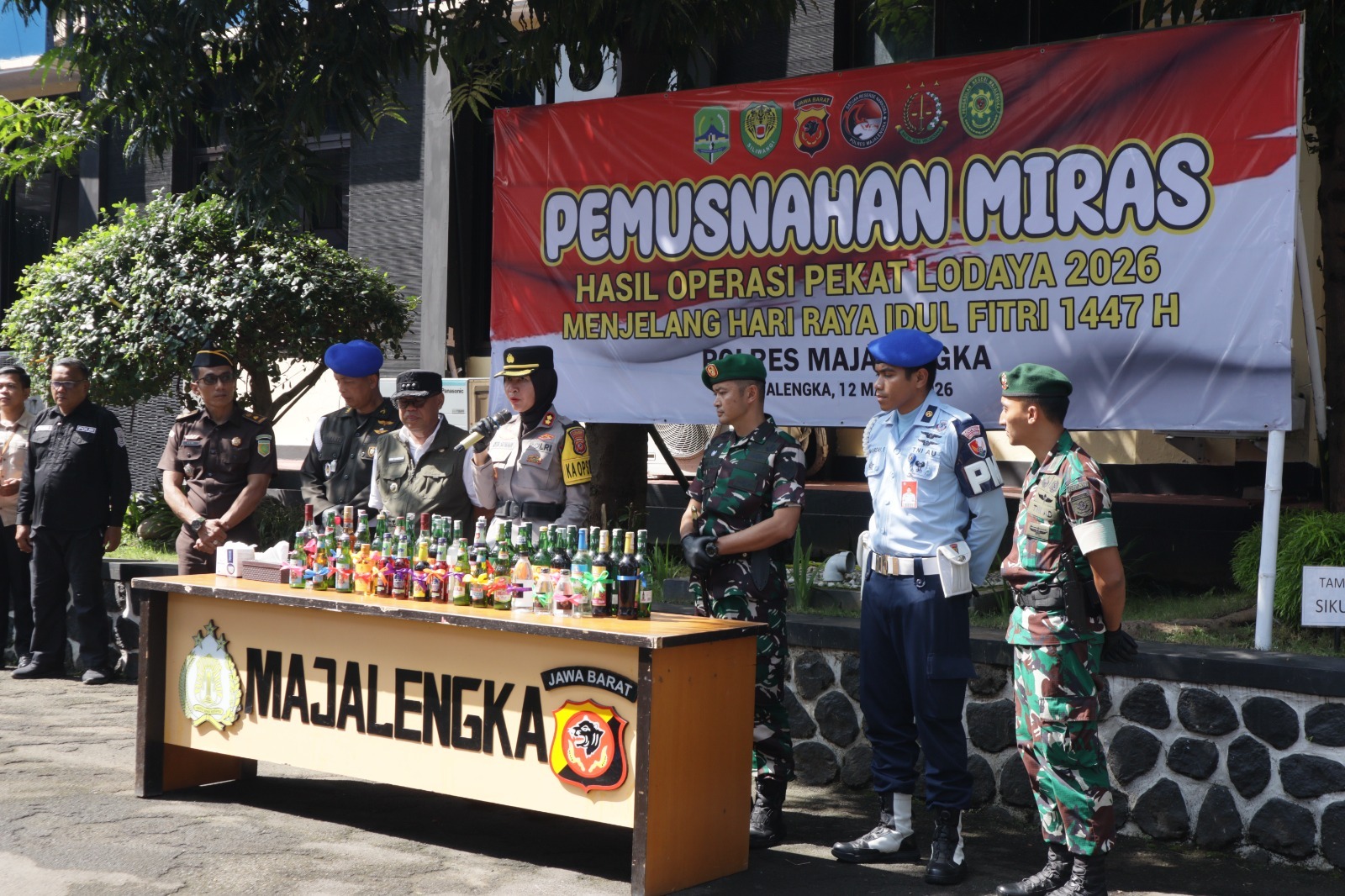 Majalengka, Segera setelah pelaksanaan Apel Gelar Pasukan Operasi Ketupat Lodaya 2026, Polres Majalengka melanjutkan agenda penting berupa pemusnahan ribuan botol minuman keras (miras) berbagai merk di halaman Mapolres Majalengka pada Kamis (12/3/2026). Kegiatan ini dipimpin langsung oleh Kapolres Majalengka AKBP Rita Suwadi, S.H., S.I.K., M.M., dengan didampingi oleh Bupati Majalengka Drs. H. Eman Suherman, M.M., Dandim 0617/Majalengka Letkol Inf. Fahmi Guruh Rahayu, S.I.P., M.I.P., serta unsur Forkopimda Kabupaten Majalengka lainnya yang turut hadir dalam rangkaian acara tersebut.