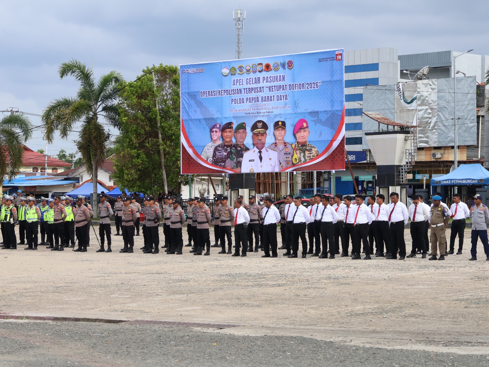 KOTA SORONG PBD, BUSERJATIM.COM GROUP– Polda Papua Barat Daya Menggelar Apel Gelar Pasukan Operasi Kepolisian Terpusat (KETUPAT) Dofior 2026 Yang Dipimpin Langsung Kapolda Papua Barat Daya Brigjen Pol. Gatot Haribowo, Di Alun Alun Kabupaten Sorong, Aimas.