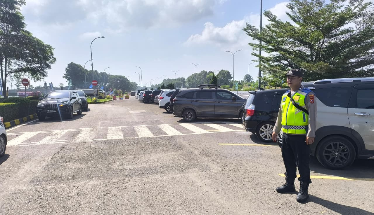 Personil Pos Pelayanan (Pos Yan) Rest Area KM 130A Tol Cipali secara intensif melaksanakan pengaturan parkir kendaraan dan memberikan imbauan kamtibmas kepada para pengunjung, Senin (16/03/2026).