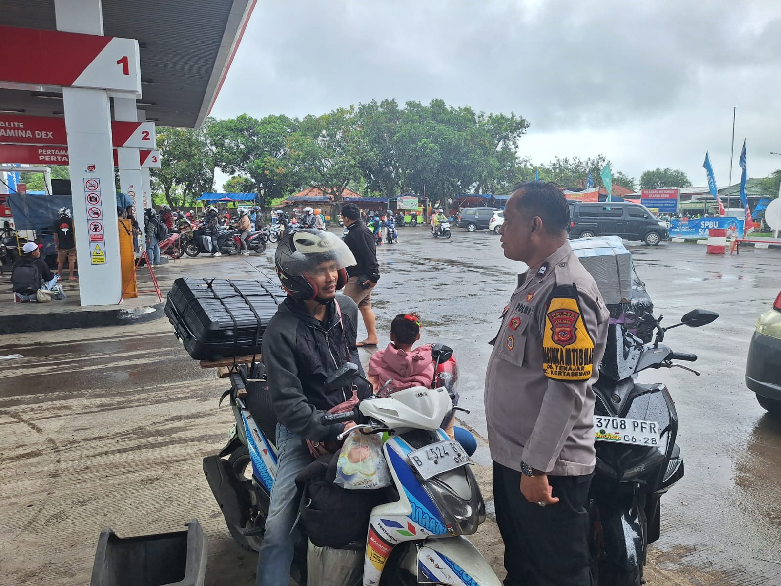 Kawal Sisa Arus Balik, Polsek Sukagumiwang Sambangi Pemudik di SPBU Berikan Imbauan Keselamatan