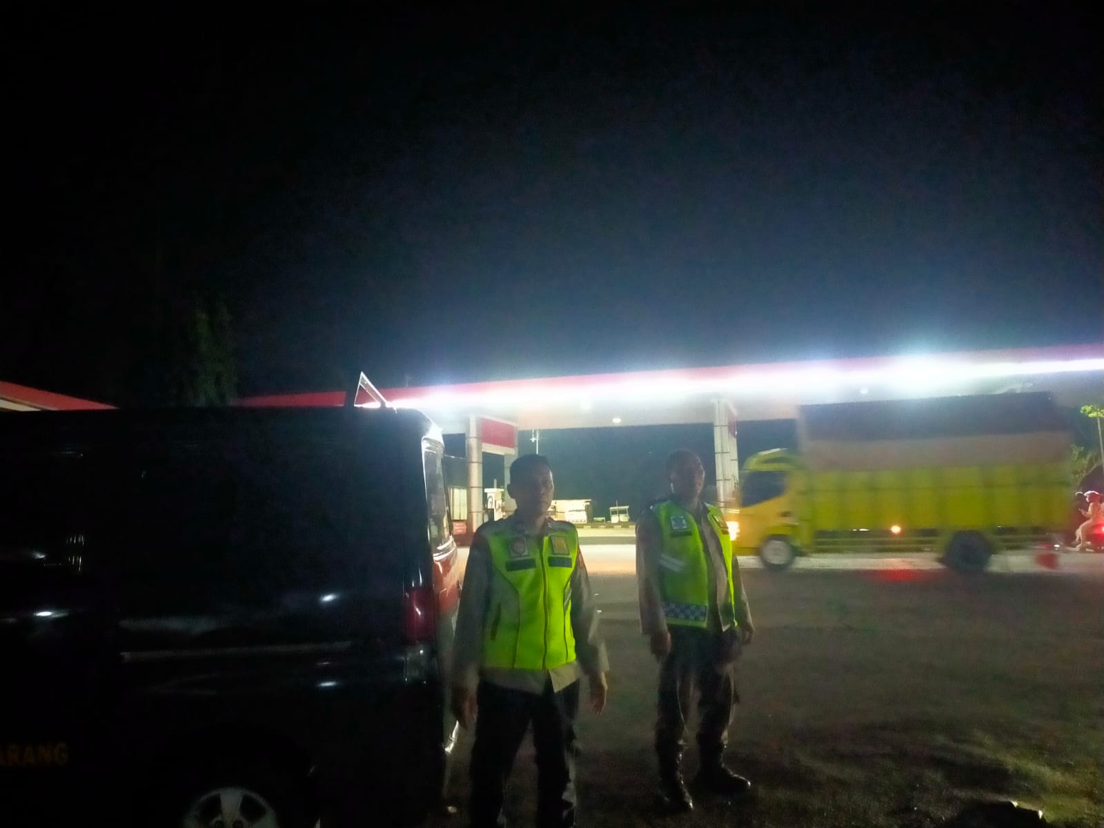 Personel bersiaga di titik-titik rawan kecelakaan (laka lantas) untuk memberikan peringatan visual kepada pengguna jalan agar tetap waspada saat berkendara di malam hari.