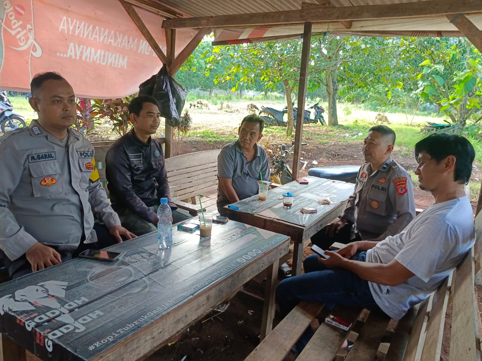 Dalam kegiatan tersebut, petugas berdiskusi santai bersama warga di sebuah warung sederhana, membahas kondisi keamanan lingkungan sekitar.