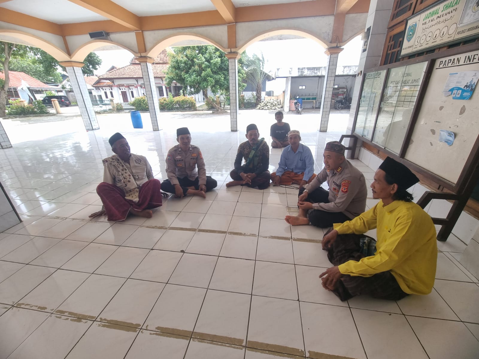 Dalam suasana penuh keakraban di selasar masjid, AKP Suripto duduk bersama para tokoh agama dan jemaah untuk berdialog mengenai situasi keamanan di lingkungan sekitar.
