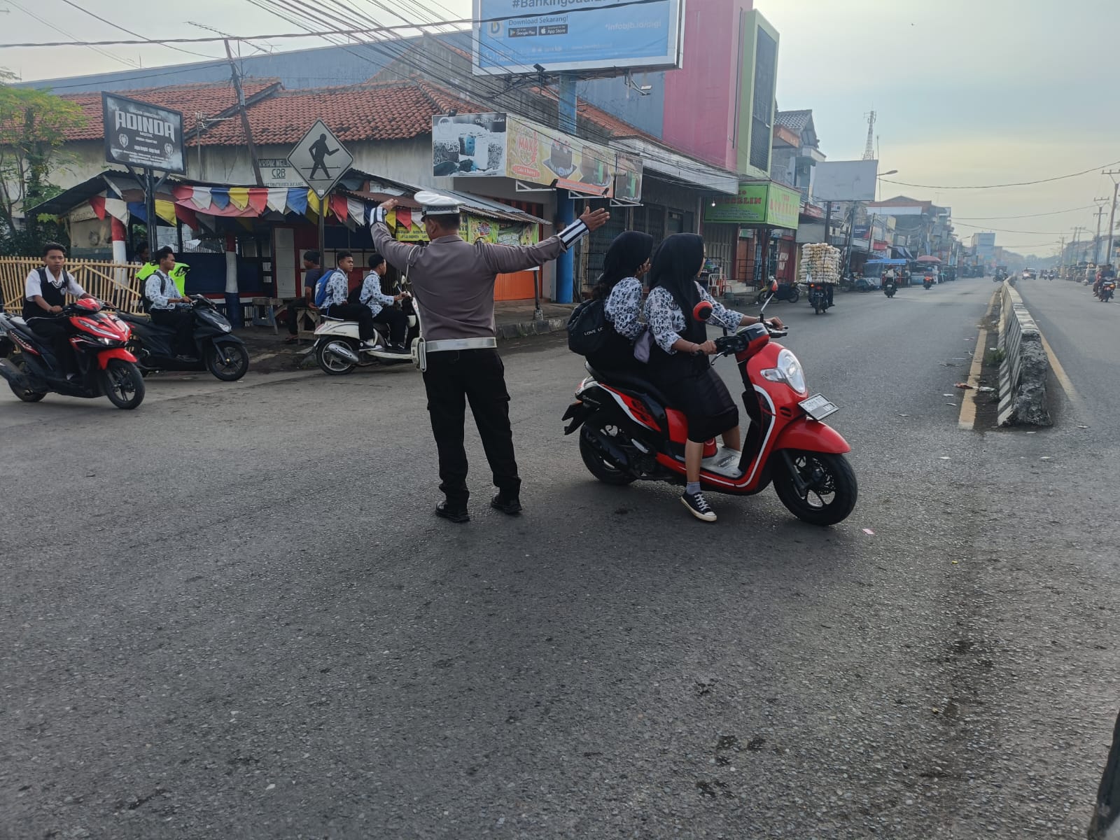 Salah satu personel yang bertugas, Bripka Wandi, tidak hanya fokus mengatur pergerakan kendaraan, tetapi juga aktif membantu menyeberangkan anak sekolah guna memastikan keselamatan mereka di tengah padatnya arus kendaraan.