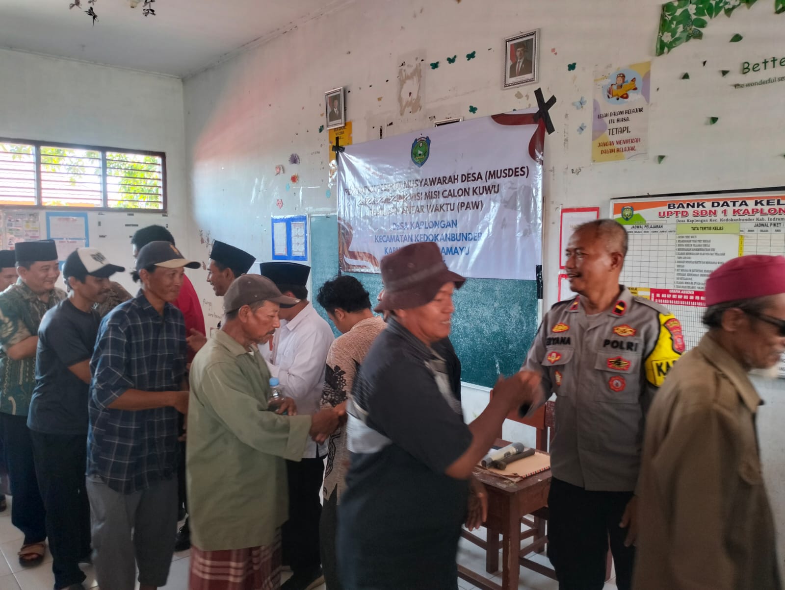 Bertempat di ruang kelas SDN 1 Kaplongan, panitia sukses menyelenggarakan kegiatan penetapan peserta Musyawarah Desa (Musdes) sekaligus penyampaian visi dan misi dari para calon Kuwu PAW, Minggu (12/4/2026).