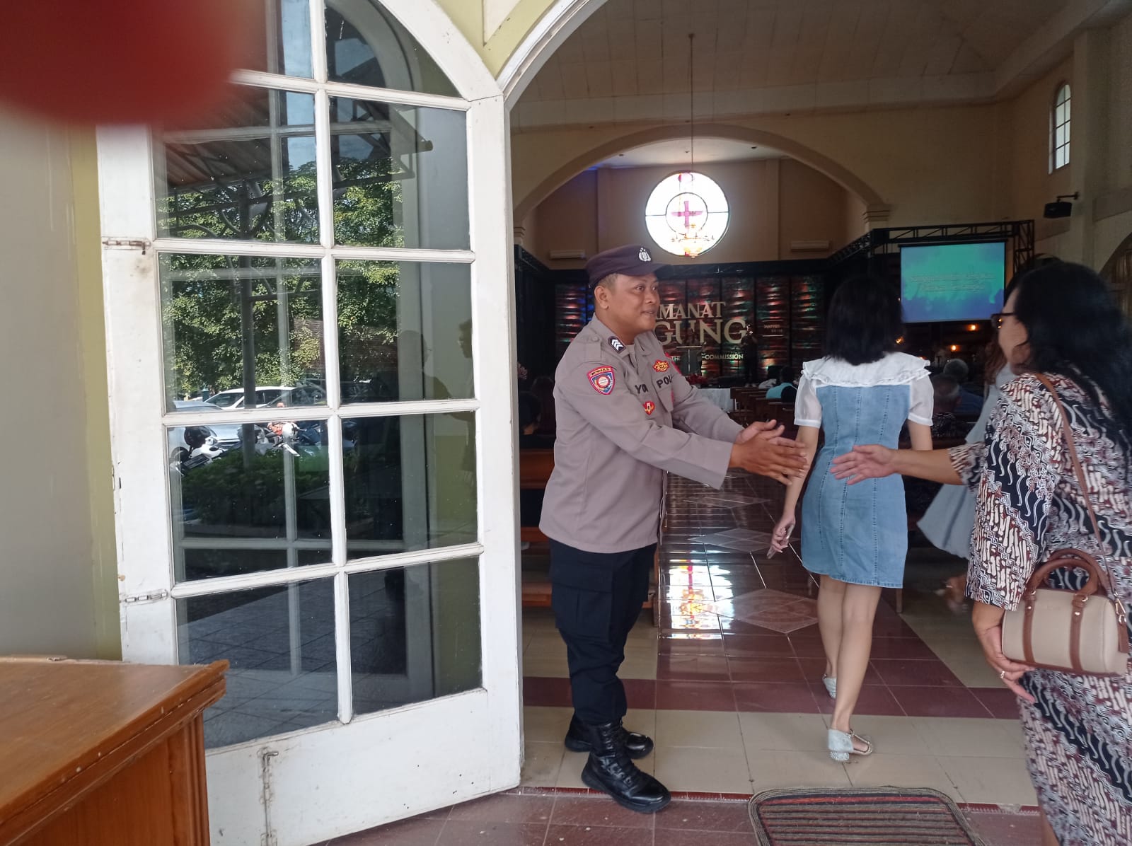 Pantauan di lapangan, personel kepolisian tampak berjaga di pintu masuk gereja, menyapa ramah para jemaat, hingga membantu kelancaran arus lalu lintas di sekitar rumah ibadah.