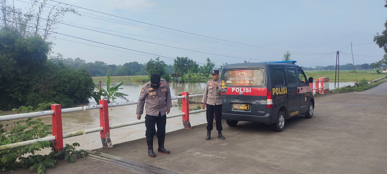 Indramayu – Kepolisian Sektor (Polsek) Kroya Polres Indramayu Polda Jawa Barat, melakukan pemantauan dan pengecekan terhadap debit air sungai yang meluap ke pemukiman dan jalan desa akibat tingginya curah hujan di wilayah Kecamatan Kroya, Kabupaten Indramayu.