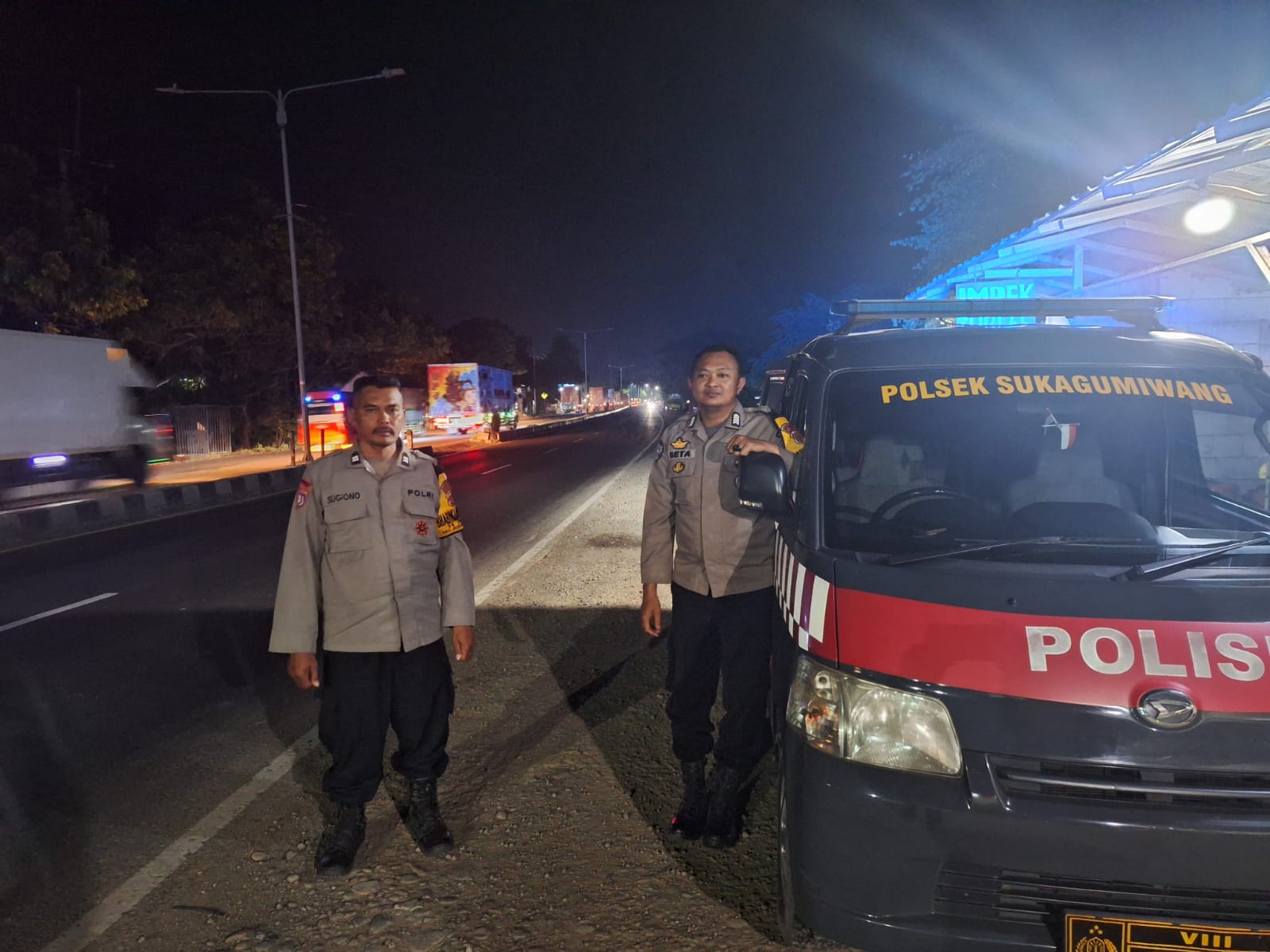 Dalam pelaksanaannya, personel Polsek Sukagumiwang melakukan mobilisasi menggunakan kendaraan dinas dengan lampu rotator menyala.