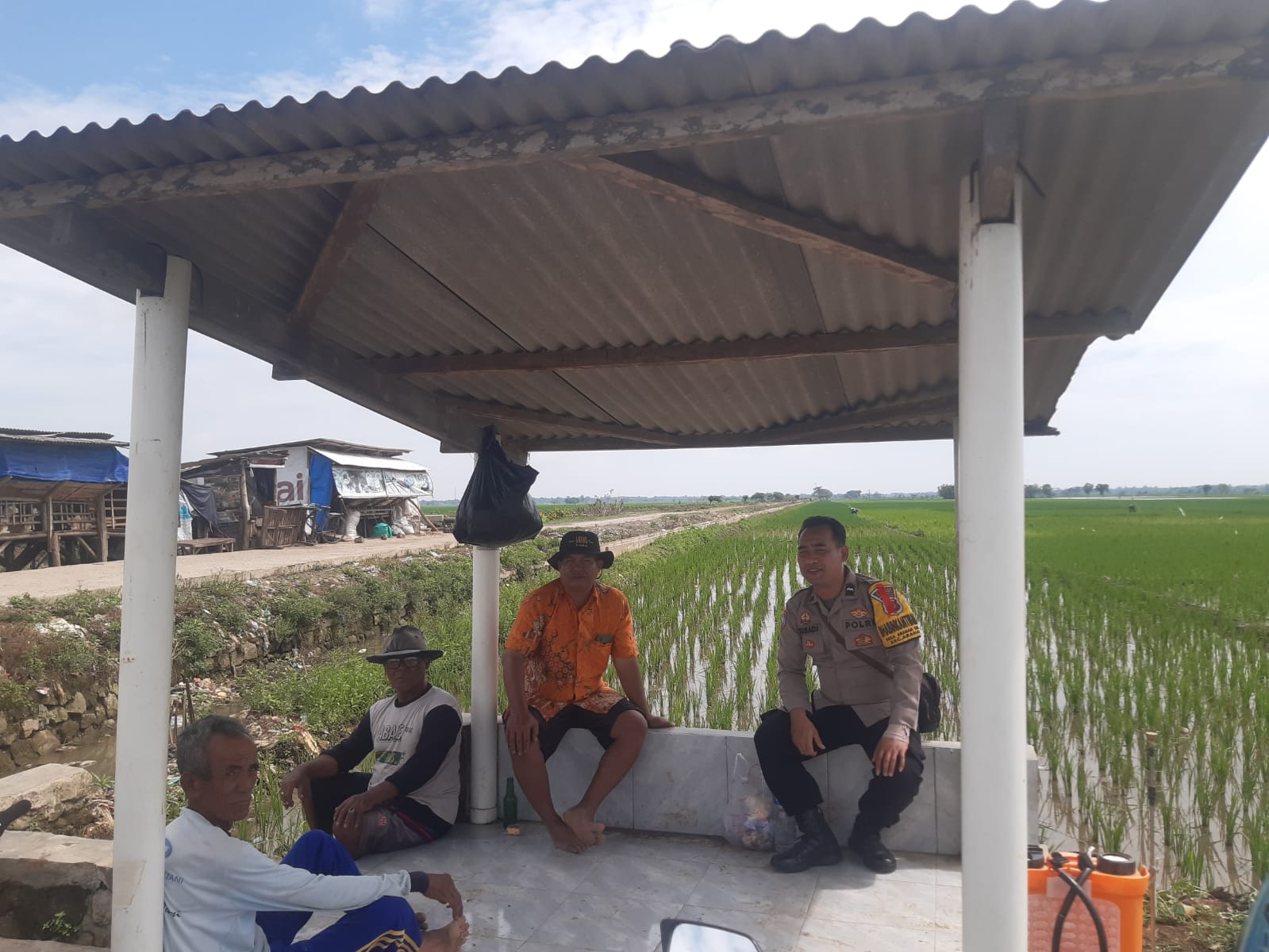 Kegiatan ini dilaksanakan dengan suasana penuh keakraban di area persawahan, di mana petugas duduk bersama warga untuk berdialog mengenai situasi keamanan di lingkungan desa secara santai namun bermakna.