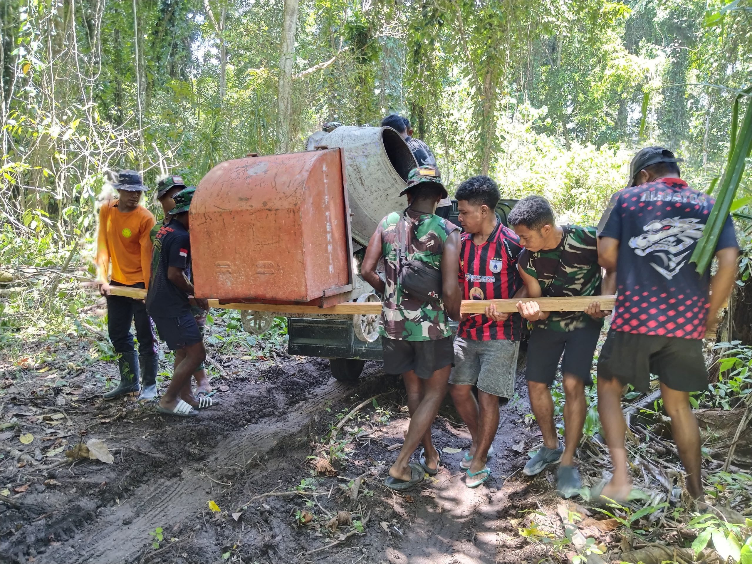 Dalam kegiatan tersebut, terlihat kekompakan antara prajurit TNI dan warga setempat saat menurunkan serta memindahkan mesin molen dan perlengkapan pendukung lainnya dari kendaraan menuju lokasi pekerjaan. Kondisi jalan tanah yang sempit dan licin di tengah area perkebunan tidak menjadi penghalang, justru semakin memperkuat semangat gotong royong di lapangan.