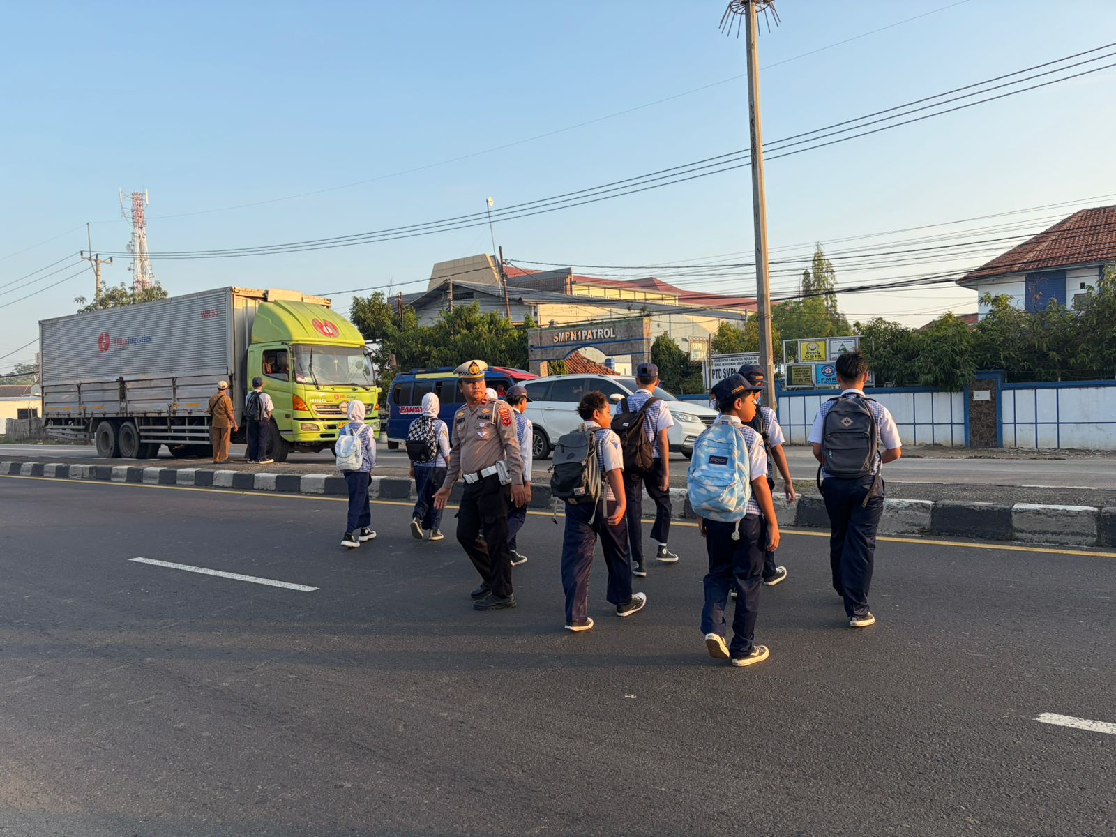 INDRAMAYU,- Unit Lalu Lintas Polsek Patrol Polres Indramayu Polda Jabar hadir di tengah padatnya arus lalu lintas pagi hari di depan SMPN 1 Patrol, Kabupaten Indramayu, Senin (27/4/2026).
