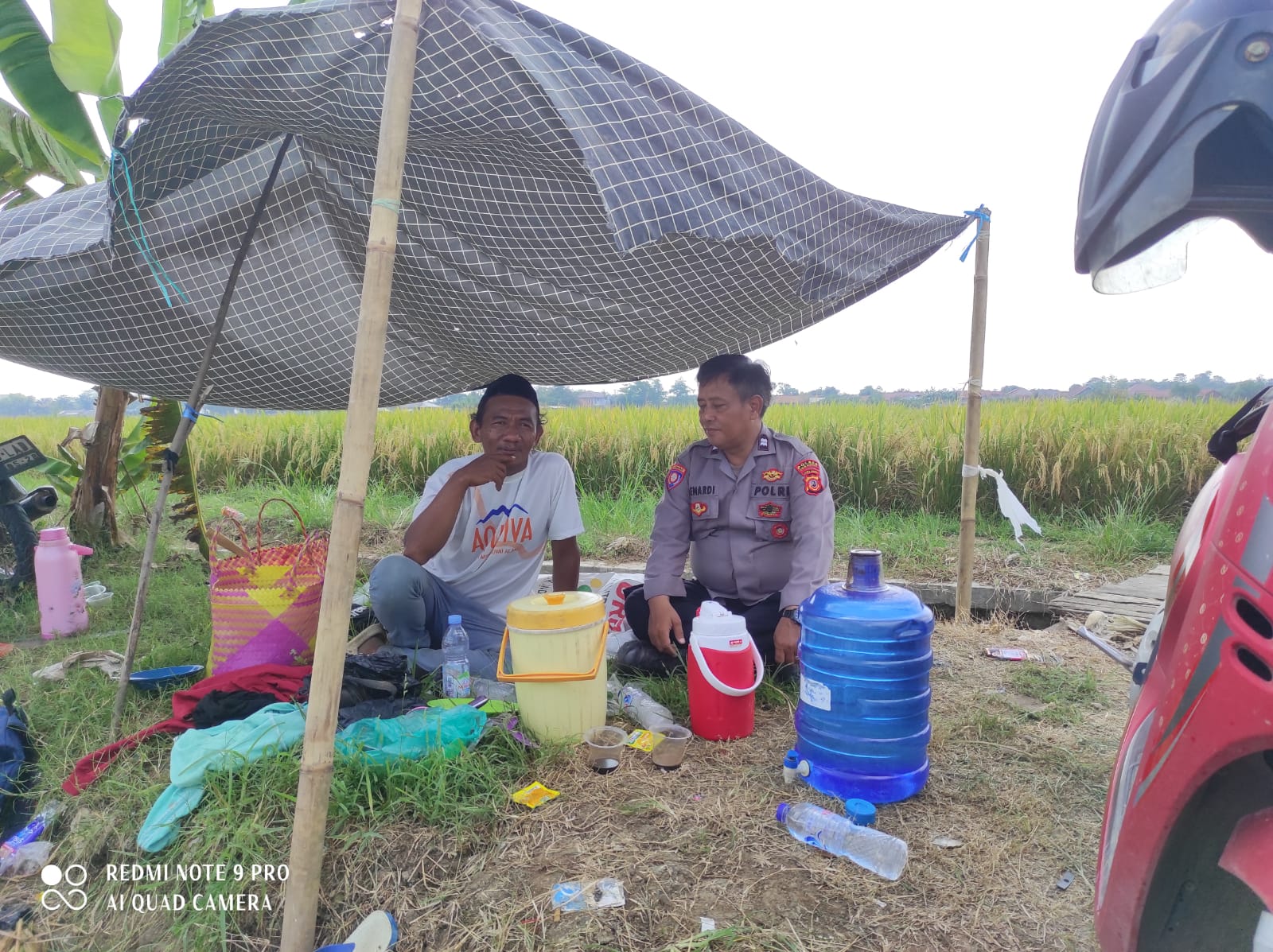 Terlihat Bhabinkamtibmas di bawah tenda sederhana di tengah area pertanian ini menjadi cerminan nyata dari pendekatan humanis yang dilakukan oleh Polsek Anjatan.